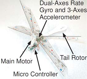 市販の「メカトンボ」というラジコン玩具に小型計算機,角速度・加速度・光センサなどを搭載し,胴体ピッチ角の制御やLEDのトラッキング制御を行なった.