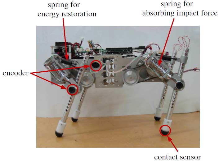四足動物のバウンド歩容(bound gait)では、通常一周期内にextented flight phaseとgathered flight phaseという異なる二つの跳躍相が現れる。これまで四脚ロボットを用いてバウンド歩容を実現した例はいくつかあるが、そこでは一周期内にi一回の跳躍期(二つのうちどちらか一つ跳躍相)しか現れていなかった。